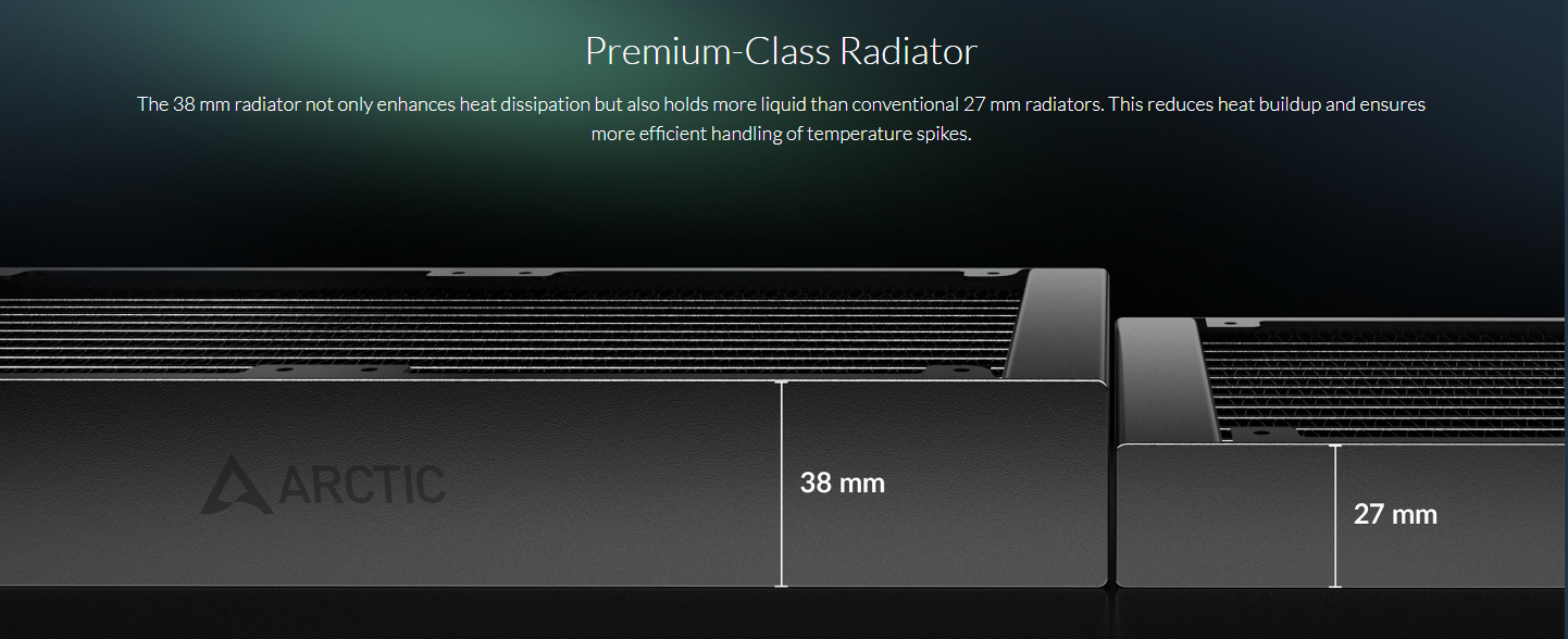 Arctic Liquid Freezer III PRO 420mm là lựa chọn lý tưởng cho người dùng yêu thích hiệu năng cao mà không cần đèn RGB. Radiator 38mm vượt trội giúp tăng cường khả năng giải nhiệt và dung tích nước so với các AIO thông thường. Ba quạt P14 Pro đẩy luồng gió mạnh đến 110 CFM và áp lực tĩnh 5.2 mmH₂O, giúp làm mát dàn lá tản hiệu quả ngay cả khi bạn ép xung hay xử lý công việc nặng.