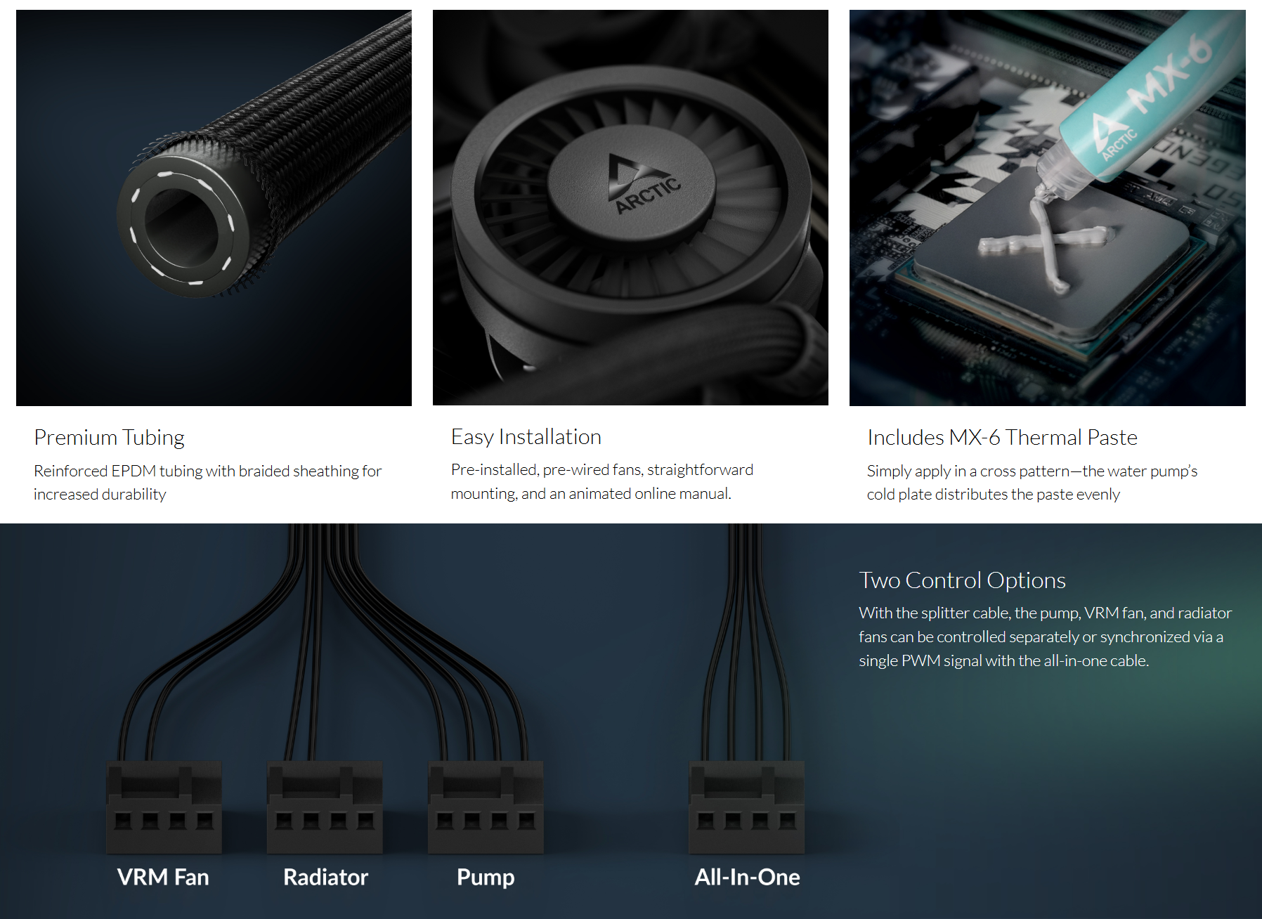 Quạt được lắp sẵn, dây được đi ẩn gọn gàng, ống dẫn nước được bọc lưới tăng độ bền, và keo MX-6 tặng kèm giúp bạn lắp đặt dễ dàng, nhanh chóng mà vẫn đạt hiệu quả tối đa. Tông màu đen nhám toàn bộ phù hợp hoàn hảo với các bộ máy "stealth build".