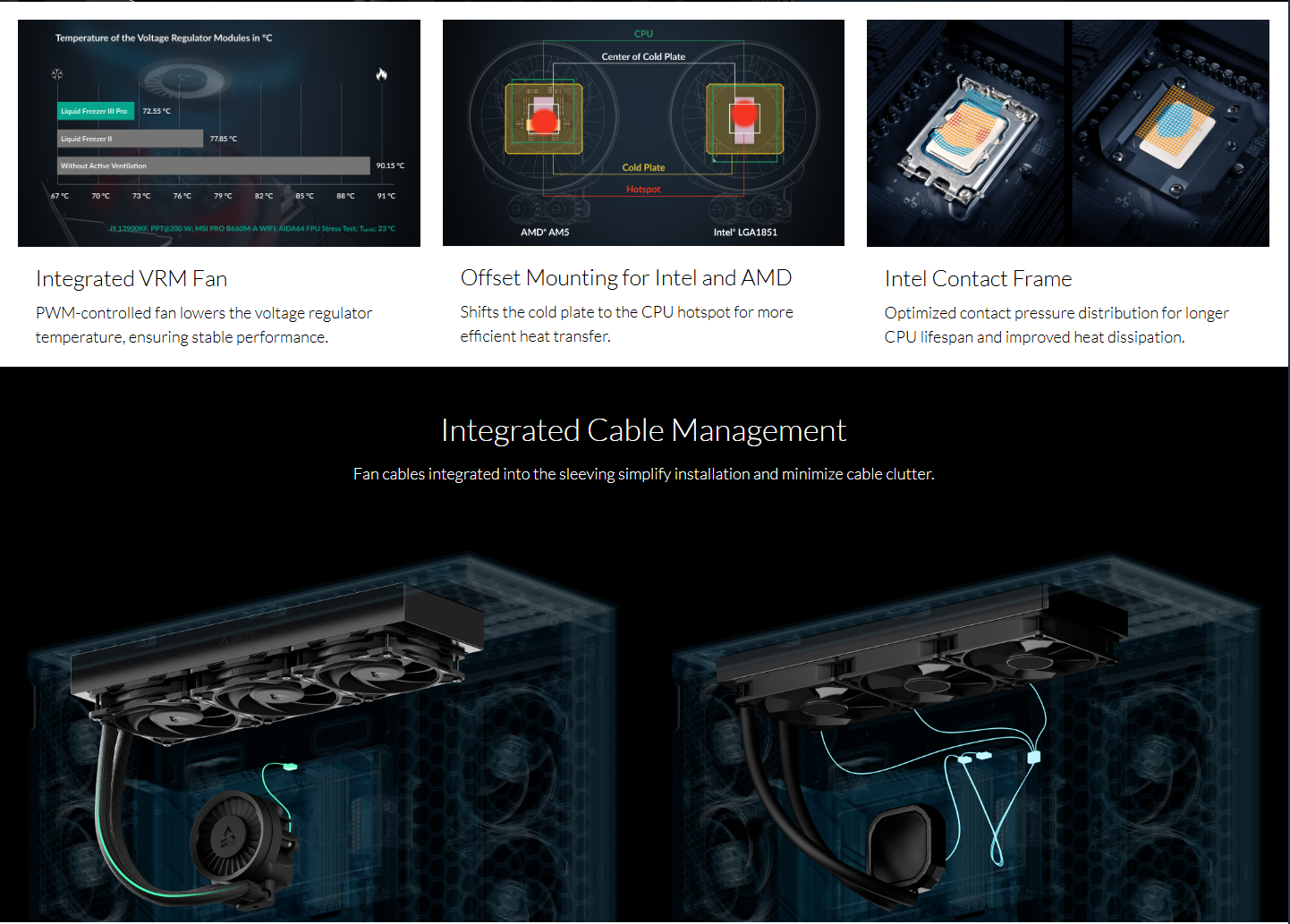 Cải tiến đáng kể đến từ bơm nước thế hệ mới, điều khiển PWM thông minh, cùng coldplate chuyên biệt giúp tập trung xử lý các điểm nóng trên CPU nhanh chóng. Ngoài ra, quạt VRM tích hợp làm mát trực tiếp khu vực cấp điện trên bo mạch chủ, đảm bảo dòng điện ổn định và nhiệt độ thấp kể cả khi hệ thống hoạt động lâu dài.