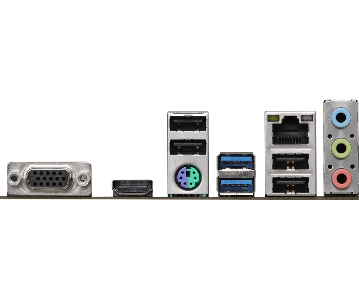 | Cổng kết nối | HDMI RJ-45 LAN USB 3.2 Gen1 PS/2 Mouse/Keyboard USB 2.0 D-Sub HD Audio Jacks |