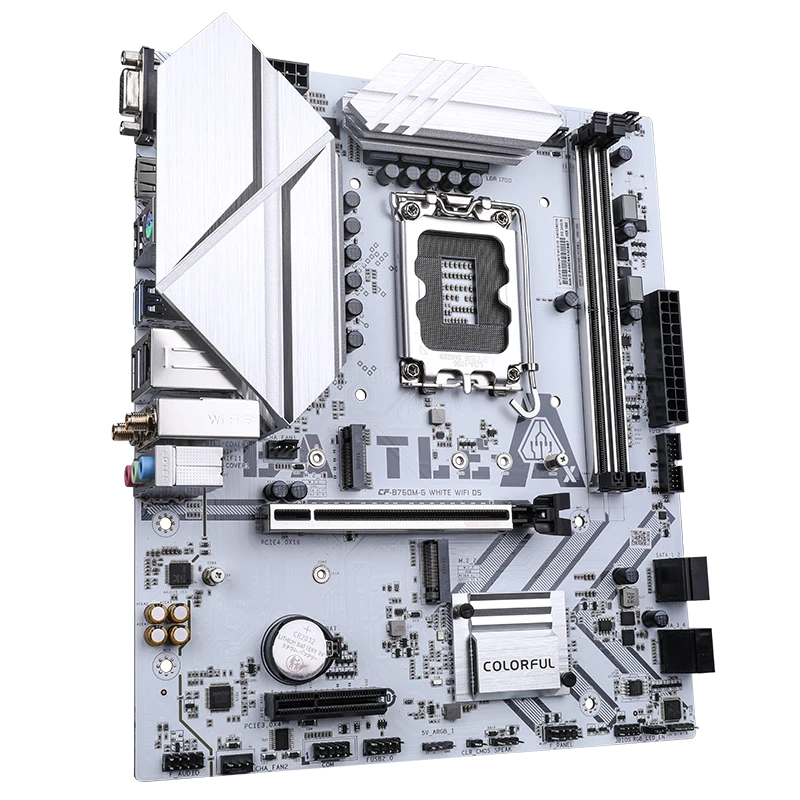 Mainboard COLORFUL BATTLE-AX B760M-G WHITE WIFI D5 V20A là bo mạch chủ chuẩn Micro-ATX thuộc dòng BATTLE-AX, mang đến lựa chọn cân bằng giữa hiệu năng, độ ổn định và chi phí hợp lý cho các hệ thống PC Intel hiện đại. Thiết kế màu trắng tinh tế kết hợp với kết nối không dây tích hợp giúp sản phẩm không chỉ vận hành mạnh mẽ mà còn hài hòa với phong cách build sáng màu.