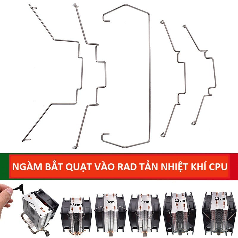 Bộ sản phẩm bao gồm: 2 gông/nẹp kim loại vào lỗ bắt vít trên fan và gắn vào khối tản bằng cách gài vào lẫy.