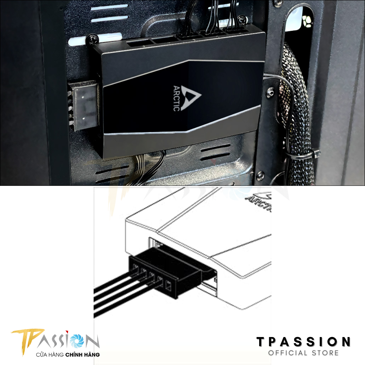Hub có 2 đầu: 1 đầu tín hiệu điều tốc bạn kết nối vào cổng FAN chân 4 pin PWM có trên bo mạch chủ (mainboard). Đầu còn lại bạn kết nối với cổng nguồn SATA của nguồn (PSU).