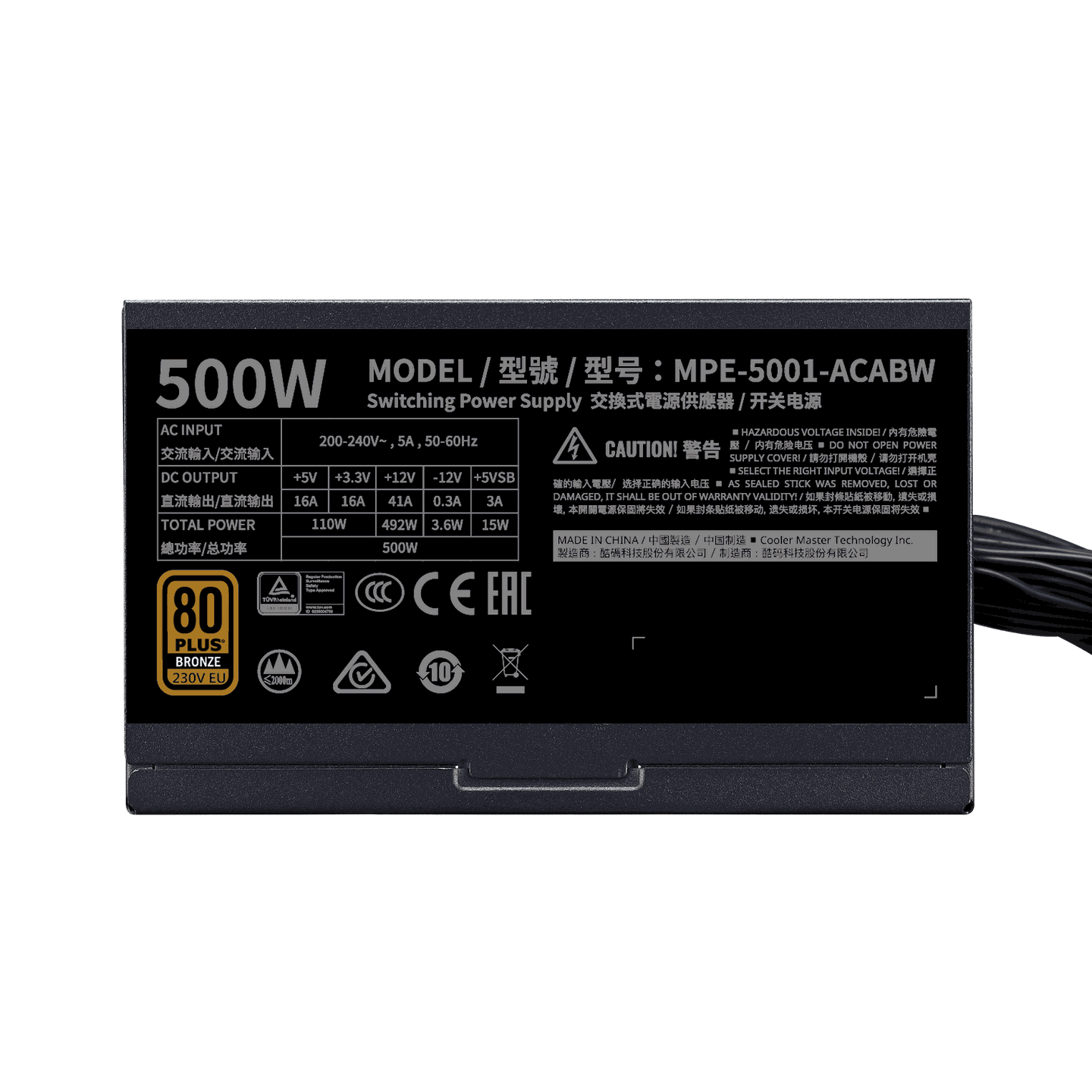 Nguồn Cooler master MWE 500 BRONZE V2 230V mang đến giải pháp năng lượng đơn giản, tin cậy dành cho hệ thống máy tính của bạn một cách an toàn và hiệu quả ở mức đầu tư thấp. Chứng nhận hiệu suất 80 PLUS Bronze, thiết kế mạch DC-to-DC, đường +12V single rail, công nghệ active PFC, và quạt làm mát theo nhiệt độ HDB giúp bộ nguồn đảm bảo luôn hoàn thành nhiệm vụ của nó. Bộ nguồn này sẽ đáp ứng mọi nhu cầu sử dụng máy cốt lõi của bạn mà không gặp phiền hà hay thách thức nào từ những tính năng đặc biệt phát sinh, đồng bộ phần mềm hay bất cứ trở ngại nào khác. Chỉ cần cắm dây vào mọi linh kiện cần thiết và bạn đã sẵn sàng làm việc. Để có được trải nghiệm làm việc tốt nhất, bộ nguồn MWE Bronze V2 là sự lựa chọn mà bạn khó có thể bỏ qua.