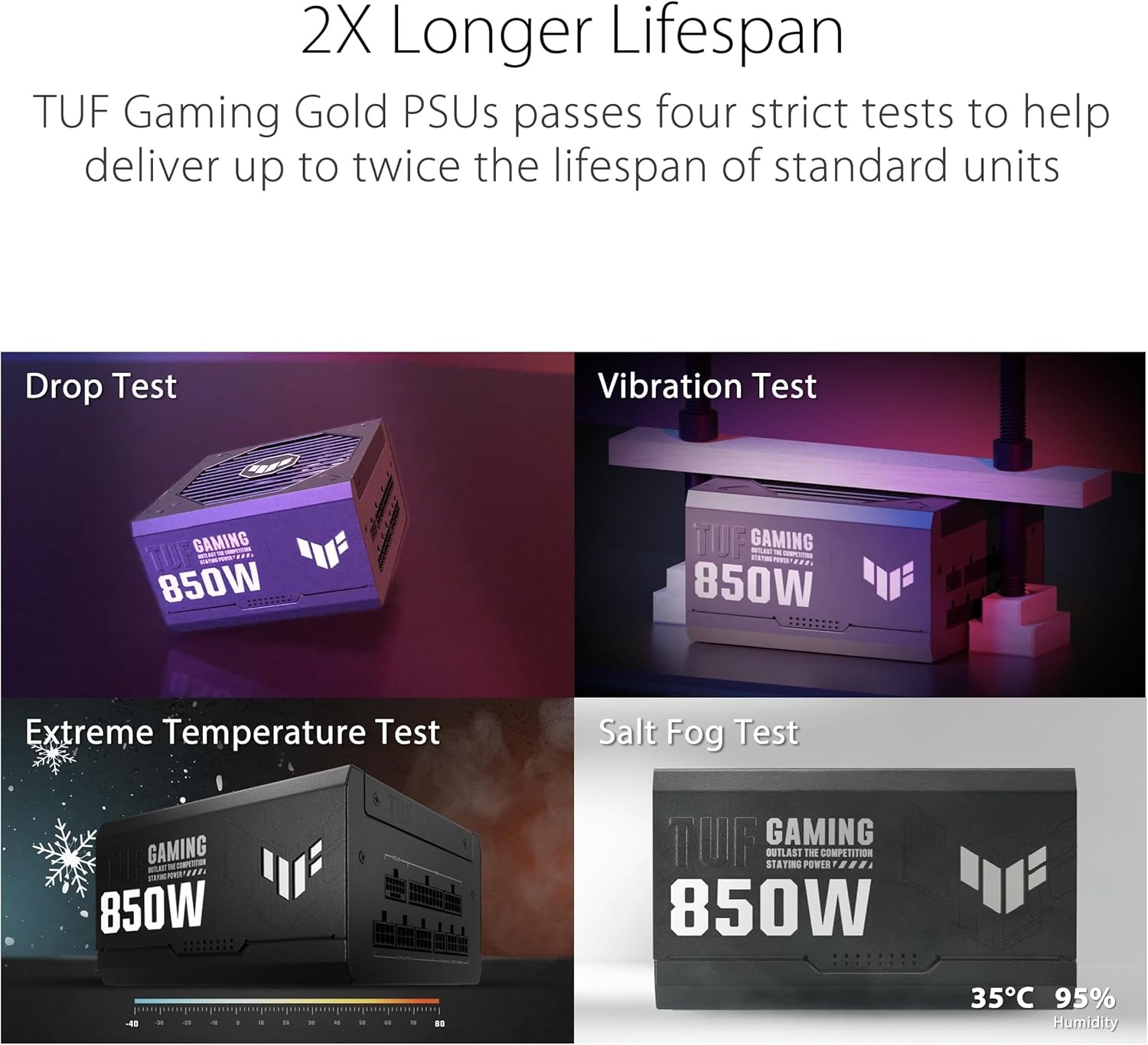 Asus TUF Gaming 850W Gold sở hữu sức mạnh cấp quân sự, thiết kế quạt hàng đầu và lớp bảo vệ PCB để cung cấp điện năng hiệu quả và bền bỉ. Kết quả là một PSU sẽ cung cấp nhiên liệu cho giàn khoan của bạn một cách đáng tin cậy trong nhiều năm tới.