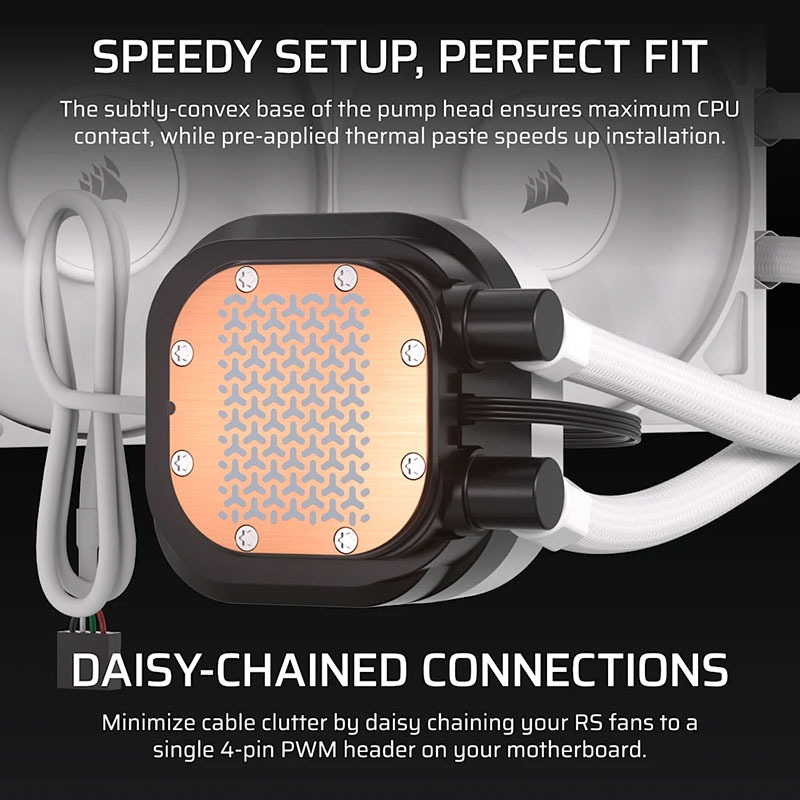 Hiệu quả truyền nhiệt của tản nhiệt nước phụ thuộc rất lớn vào bề mặt tiếp xúc giữa block nước và vi xử lý, và Corsair đã tối ưu hóa điều này bằng một thiết kế đế đồng (Cold Plate) hơi lồi nhẹ. Cấu trúc bề mặt được chế tạo chính xác này giúp đảm bảo sự tiếp xúc tối đa và chặt chẽ nhất với nắp lưng (IHS) của CPU, khắc phục các điểm không bằng phẳng vi mô thường gặp. Bên cạnh đó, một lớp keo tản nhiệt chất lượng cao đã được in sẵn trên bề mặt đế đồng theo một khuôn mẫu tối ưu, giúp quá trình lắp đặt trở nên nhanh chóng và đảm bảo lượng keo vừa đủ để dẫn nhiệt tốt nhất mà không bị tràn. Sự kết hợp giữa vật liệu đồng nguyên chất dẫn nhiệt tốt và thiết kế hình học thông minh này giúp thiết bị duy trì nhiệt độ CPU luôn ở mức thấp ổn định trong mọi tác vụ.
