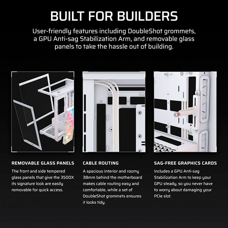 Corsair 3500X RS-R ARGB White nổi bật với thiết kế wraparound glass view – mặt trước và bên hông đều bằng kính cường lực trong suốt giúp phô diễn toàn bộ linh kiện bên trong như một tác phẩm nghệ thuật. Kính có thể tháo rời dễ dàng, cho phép người dùng thao tác, vệ sinh hoặc nâng cấp nhanh chóng. Toàn bộ khung case được làm từ thép sơn tĩnh điện đen nhám kết hợp đường nét sắc sảo, mang lại vẻ ngoài mạnh mẽ, tinh tế và bền bỉ. Đây là dòng case lý tưởng cho các build PC cao cấp, đặc biệt khi kết hợp cùng hệ thống RGB rực rỡ bên trong.
