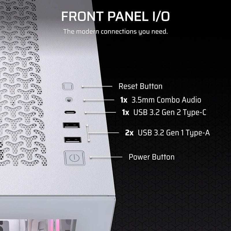 Ở mặt trước, Corsair 3500X RS-R ARGB White được trang bị cổng USB 3.2 Gen2 Type-C, 2 cổng USB 3.2 Gen1 Type-A và jack âm thanh combo Audio in/out, giúp kết nối nhanh chóng với các thiết bị ngoại vi. Case cũng tương thích với mainboard hỗ trợ reverse connection, mang đến khả năng đi dây ngược (cáp cắm phía sau mainboard), tạo nên mặt trước gọn gàng và không dây rối, xu hướng mới trong thiết kế PC hiện đại. Bên cạnh đó, 7 khe PCIe ngang hoặc 4 khe dọc (vertical GPU mount) cho phép người dùng lắp card đồ họa theo chiều dọc để tối ưu thẩm mỹ.