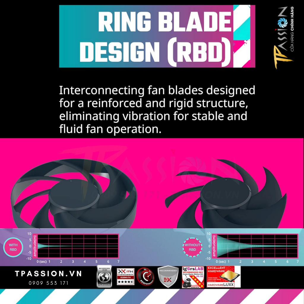 ✅ THIẾT KẾ RING BLADE (RBD): Các cánh quạt kết nối với nhau cho cấu trúc cứng và chắc chắn loại bỏ rung động để quạt vận hành ổn định và êm ái.