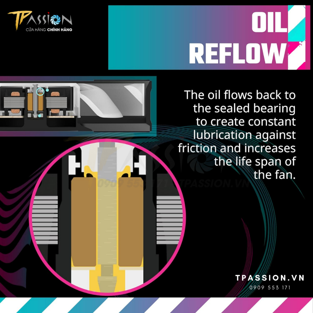 CÔNG NGHỆ TÁI SỬ DỤNG DẦU BÔI TRƠN: Dầu chảy trở lại vòng bi kín để tạo ra sự bôi trơn liên tục chống ma sát và tăng tuổi thọ của quạt.