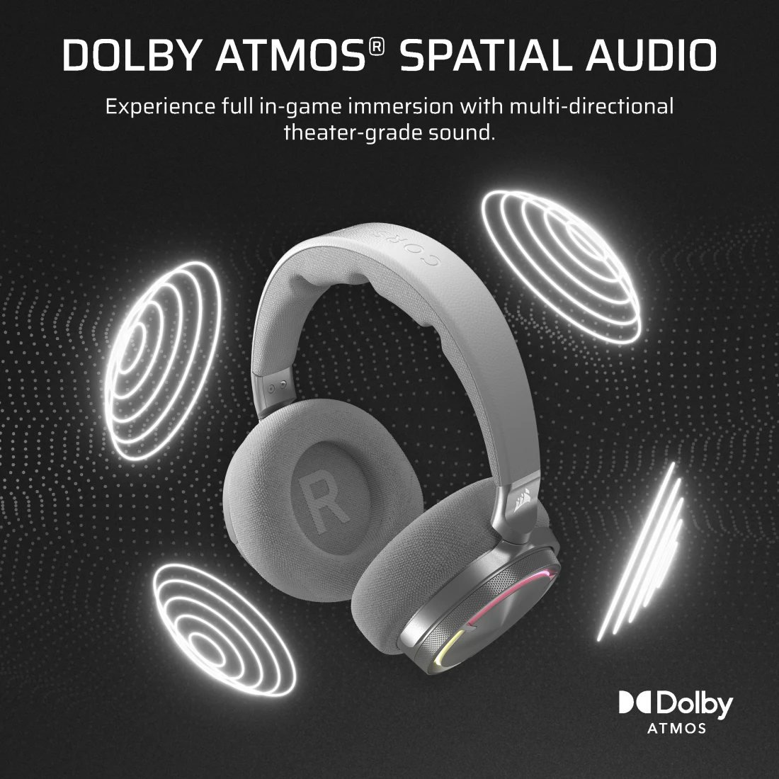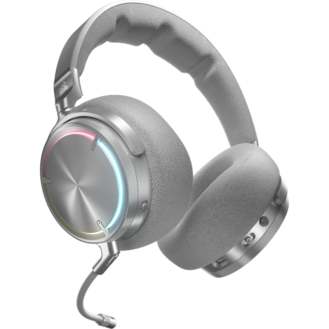 Hệ thống đèn LED RGB tùy chỉnh trên tai nghe không dây tạo điểm nhấn hiện đại và có thể đồng bộ hóa với các thiết bị Corsair khác thông qua phần mềm iCUE.