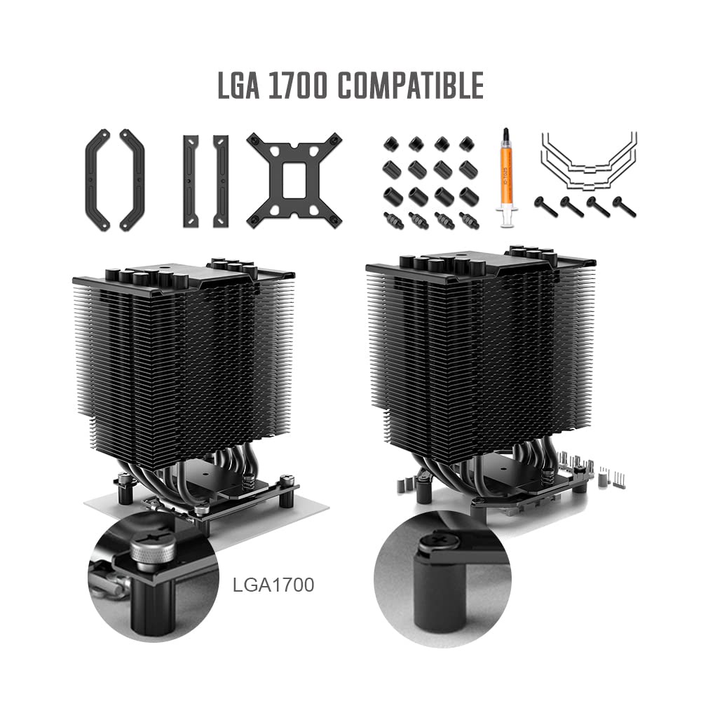 ✔️ Trang bị 6 ống đồng nguyên chất, sơn đen tĩnh điện, mặt tiếp xúc CPU làm từ đồng nguyên khối, có top cover thiết kế phay xước chắc chắn.