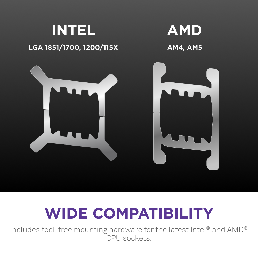 Hỗ trợ đầy đủ các socket Intel LGA 1851/1700/1200/115X và AMD AM4/AM5 cho các dòng Ryzen 3, 5, 7, 9, phù hợp với hầu hết các hệ thống PC hiện nay.