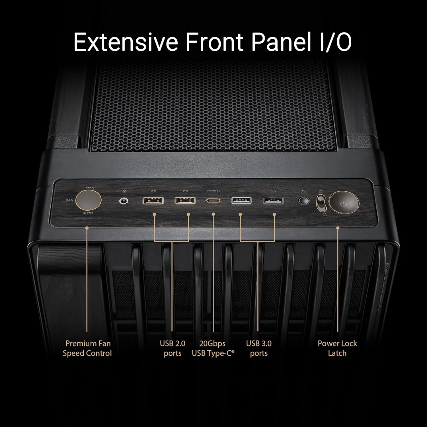 | Cổng I/O phía trước (Front I/O Port) | 2 × USB 3.2 Gen1 • 1 × USB 3.2 Gen2x2 Type-C • 2 × USB 2.0 • Nút điều khiển quạt • Nút reset |
