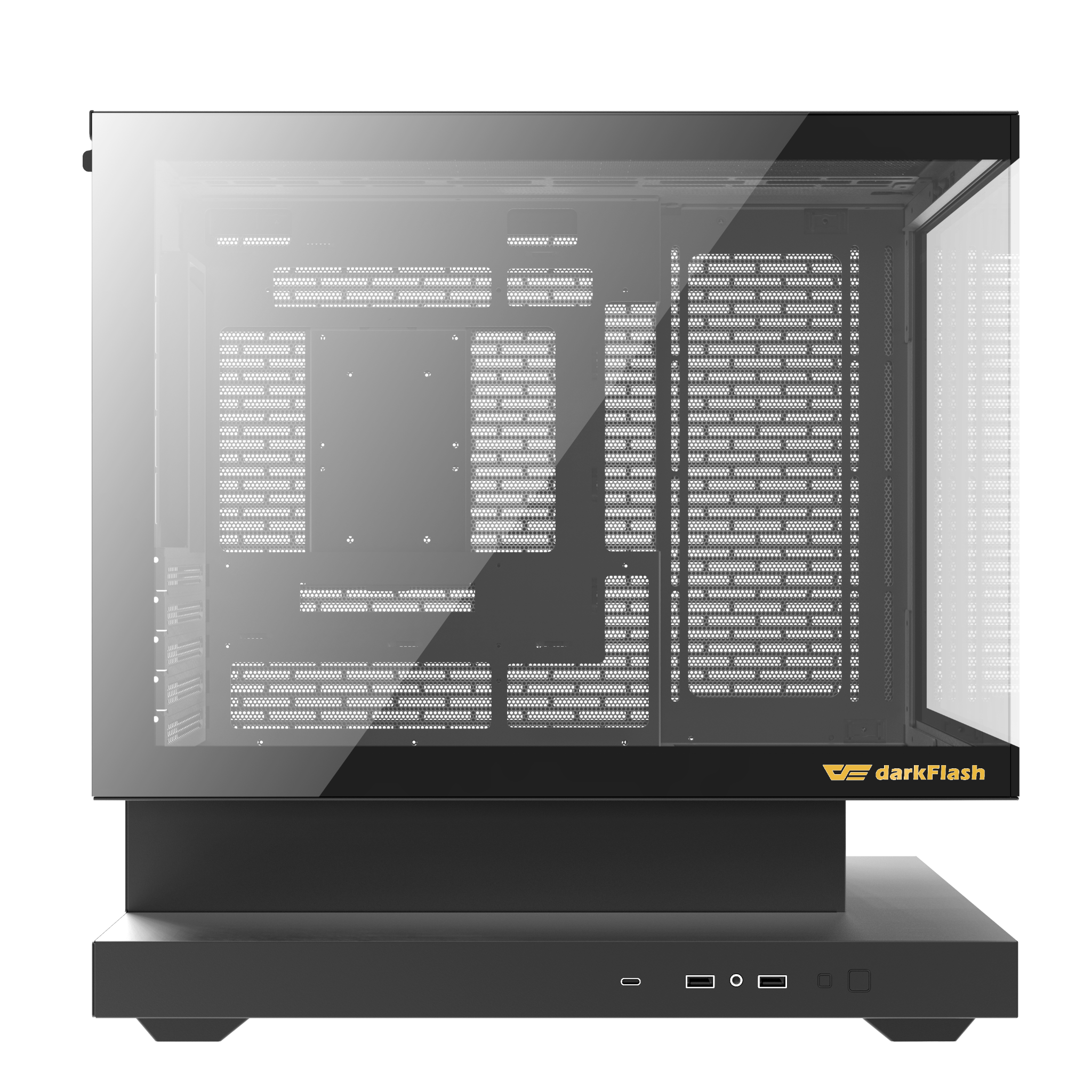 DarkFlash trang bị tối đa 3 khay HDD 3.5” và 3 khay SSD 2.5”, đảm bảo đáp ứng nhu cầu lưu trữ lớn. Cổng I/O phía trước bao gồm USB 3.0, Type-C, nút nguồn, reset và jack âm thanh HD – đầy đủ để kết nối thiết bị ngoại vi hiện đại. Với hệ thống cổng đa dạng, người dùng dễ dàng gắn các thiết bị từ gaming gear cho tới ổ cứng ngoài.