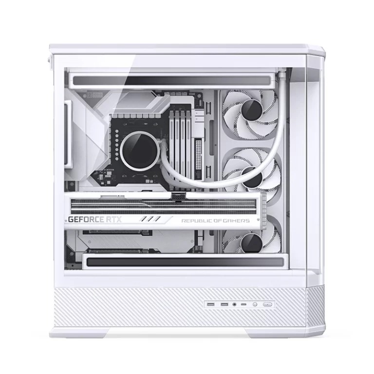 Ngay từ cái nhìn đầu tiên, Jonsbo D400 White gây ấn tượng bởi sự chỉn chu và sang trọng. Tông màu trắng phủ đều từ khung máy đến các chi tiết nhỏ tạo cảm giác sạch sẽ, hiện đại và cực kỳ phù hợp với các bộ PC phong cách minimal hoặc build theo tông trắng - RGB. Mặt hông kính cường lực được làm rộng, giúp bạn dễ dàng khoe trọn linh kiện bên trong mà vẫn giữ được độ cứng cáp, an toàn.