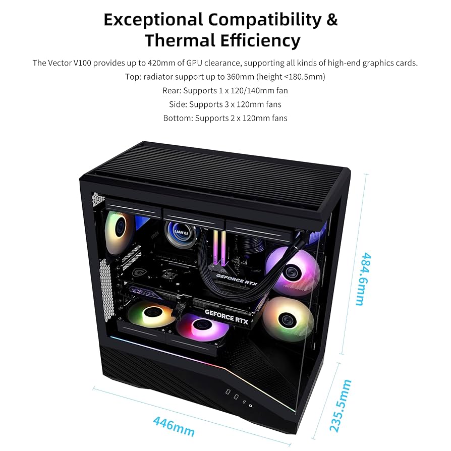 Vector V100 hỗ trợ tản nhiệt nước lên đến 360mm, kết hợp cùng không gian rộng rãi cho tối đa 7 fan giúp hệ thống luôn vận hành mát mẻ và ổn định. Bạn có thể lắp: