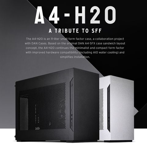 A4-H2O là case mini iTX 11 lít thuộc dự án hợp tác với DAN Cases. Dựa trên thiết kế ban đầu của DAN A4-SFX là một mẫu layout sandwich concept, A4-H2O tiếp tục cải tiến để trở nên nhỏ gọn nhất và phù hợp với các kích thước linh kiện phần cứng mới (bao gồm AIO) và lắp ráp thuận tiện nhất.