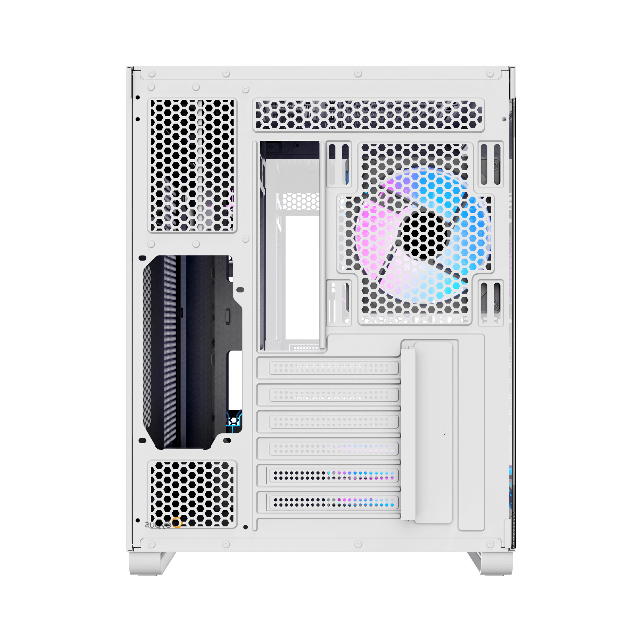 Với kích thước 425 x 295 x 388mm (L x W x H) theo chuẩn Mid Tower, vỏ case này phù hợp với hầu hết không gian setup – từ góc gaming RGB đến bàn làm việc sáng sủa, gọn gàng. Tông màu trắng mờ sang trọng không chỉ tôn lên vẻ hiện đại mà còn giúp người dùng dễ phối cùng dàn linh kiện RGB, mang lại vẻ đẹp tổng thể hài hòa và cuốn hút.