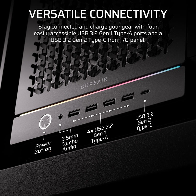 Ngoài thiết kế ấn tượng và khả năng tương thích linh hoạt, Corsair FRAME 5000D RS Airflow Black CC-9011307-WW còn được trang bị cổng I/O tiện dụng ở mặt trên, bao gồm 2 x USB 3.0, 1 x USB Type-C, 1 x Audio combo jack giúp người dùng kết nối nhanh chóng với các thiết bị ngoại vi. Nút nguồn và reset được thiết kế nhạy và bố trí hợp lý, tạo sự thuận tiện khi thao tác. Toàn bộ cổng kết nối đều được hoàn thiện cao cấp, đảm bảo tuổi thọ và độ ổn định trong suốt quá trình sử dụng. Đây là điểm cộng lớn cho người dùng văn phòng, gamer hoặc streamer cần thao tác thường xuyên với thiết bị ngoại vi.