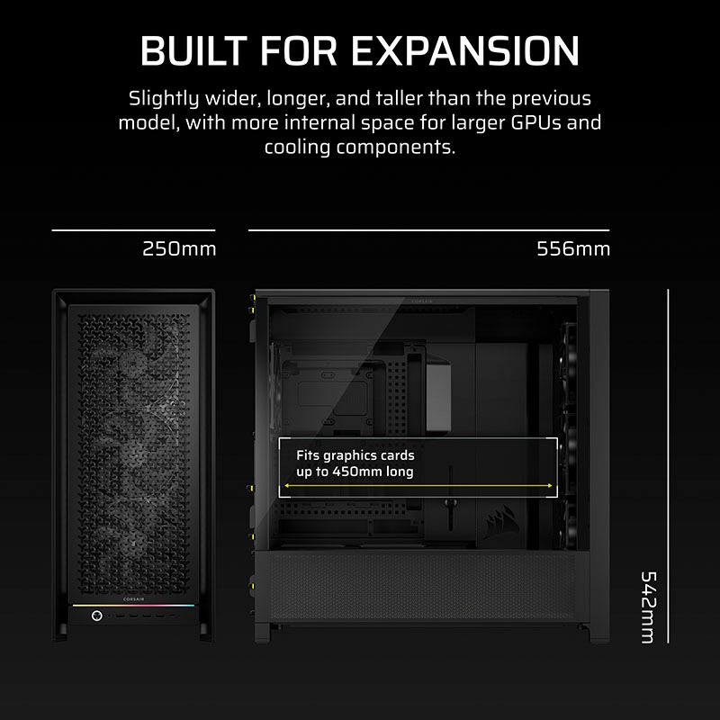 Không chỉ gây ấn tượng với khả năng tản nhiệt, case Corsair FRAME 5000D RS Airflow Black CC-9011307-WW còn có thiết kế rộng rãi, hỗ trợ lắp VGA dài tới 400mm, tản nhiệt CPU cao tới 165mm và PSU dài 210mm, mang lại sự linh hoạt tối đa khi chọn linh kiện. Hệ thống khay HDD/SSD cho phép gắn tối đa 2 HDD 3.5” và 6 SSD 2.5”, đáp ứng đủ nhu cầu lưu trữ từ cơ bản đến chuyên sâu. Không gian bên trong được sắp xếp hợp lý với các khu vực quản lý dây cáp riêng biệt, đảm bảo gọn gàng và tối ưu airflow. Việc nâng cấp hoặc thay đổi linh kiện cũng trở nên đơn giản và thuận tiện hơn bao giờ hết.